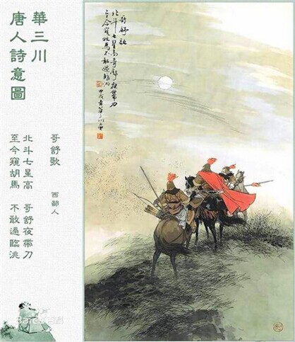 哥舒翰守边图 6、哥舒翰:(?—公元757年),突厥人,世居安西(今新疆库车),是哥舒部落首领的后裔,母亲是于阗(今新疆和田西南)王的公主。天宝六年(公元747年),哥舒翰任大斗军副使,开始独挡一面,对付吐蕃的入侵。在苦拔海一战中,哥舒翰的长枪折断了,就持半截枪与敌人搏杀,所向披靡,三路吐番军都被打跨,自此,名声大振。唐玄宗让哥舒翰担任陇右节度支度营田副大使,充任陇右(今青海乐都)节度使。哥舒翰采取步步为营的方略,在青海(今青海湖)修建了神威城和应龙城,互为掎角,战势由消极防御变为主动进攻。天宝八年(公元749年)六月,哥舒翰带领六万三千人,不惜一切代价,攻下了吐蕃占领的石堡城。唐玄宗十分欣慰,拜哥舒翰为特进、鸿胪员外卿,一个儿子成为五品官,赐物千匹,赐庄园一座。天宝十一年(公元752年),又加封开府仪同三司。大唐以此为契机,全部收复了九曲部落,大唐与吐蕃的分界线已经推进到青海湖至黄河河曲以西一线。天宝十三年七月,哥舒翰在新收复的九曲设置了洮阳(今甘肃临潭西南)、浇河(今青海贵德境)二郡,成立了宛秀、神策二军。天宝十四年(公元755年)二月,哥舒翰突然中风,只好在长安的家中养病。唐玄宗下令斩杀攻打安史叛军不力的封常清、高仙芝后,加封哥舒翰为尚书左仆射,同中书门下平章事,使其带领部队据守潼关,并率百官为他饯行。潼关在哥舒翰的经营下,固若金汤,安禄山主力部队对潼关发起进攻达半年之久,都劳而无功。首相杨国忠不断建议哥舒翰率领军队出关进攻。天宝十五年(公元756年)阴历六月四日,哥舒翰“恸哭出关”,唐军被诱入埋伏圈,哥舒翰遭到平生未有的失败,手下将哥舒翰的双脚绑在马腹上,投降了安禄山。哥舒翰归顺叛军,后被安庆绪杀死。唐诗《哥舒歌》写道:“北斗七星高,哥舒夜带刀。至今窥牧马,不敢过临洮。”这首诗的内容充分地反映了唐代居住在陇右的黎民百姓对哥舒翰的信赖和赞颂。