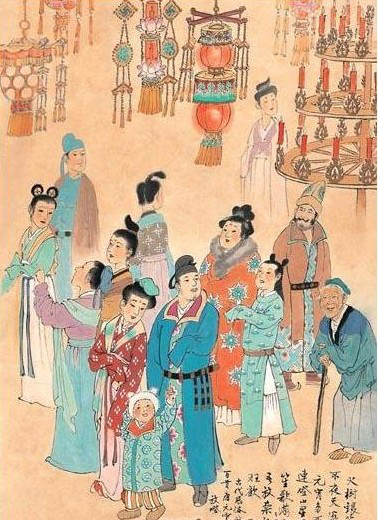 古人元宵节赏灯 隋炀帝杨广写过一首诗,题目叫《元夕于通衢建灯夜升南楼》,后六句是“灯树千光照,花焰七枝开。月影疑流水,春风含夜梅;燔动黄金地,钟发琉璃台。”描写了灯的数量、灯组成的形状、明亮的程度等。很显然,杨广是在大臣们的陪伴下,站在一个高楼上欣赏了元宵节的花灯。 但作为唐中宗的李显,却吃了螃蟹,混迹于普通市民当中,美美地欣赏了长安城的元宵灯会。史书记载,景云元年(710年)正月十四晚上,他和韦皇后穿着便装,到长安城里到处游览赏灯,一块出去的还有一千多名宫女。唐中宗高兴极了,他爱玩的兴致得到了极大的满足,但很多宫女却没有回到皇宫。她们大概已经对这个皇帝老头失去了兴趣,逃到民间去找自己的意中人去了。此时,唐中宗已经55岁,或许是他大发慈悲,故意让这些美丽动人的宫女们解脱束缚,从此让她们过上普通人的自由生活吧。五个月以后,这位两次担当皇帝的老人撒手人寰。 到了宋代,元宵节时间也延长了很多,而且比唐代更为豪华。孟元老《东京梦华录》、岳珂《桯史》都对北宋徽宗时期的元宵节作了细致的描述。元宵节放花灯从年前冬至时就开始在街上“绞缚山棚”,在棚上张灯结彩,叠成山林形状,称之为“灯山”。灯山点燃之后,万灯齐鸣,“金碧相对,锦绣交辉”。灯山还彩绘神话故事。皇宫内另置灯山,用彩带结成文殊菩萨跨狮子、普贤菩萨骑白象等。令人惊奇的是,菩萨手臂能活动自如,每个手指还能出水。灯有五色琉璃灯、白玉灯、走马灯,灯上绘有山水人物、花卉翎毛等。还有一种火龙灯,用草缚成龙状,用青布为罩,在草龙上面插上灯烛万盏,点燃后就变成一条火龙。从灯山到宣德门大街,方圆百余丈,立有高达数十丈的长竿,上面绑有灯笼,用纸糊成百戏人物,宛若天仙下凡。在相国寺大殿前还设有乐棚,在宣德楼还挂有一丈方圆的巨大灯球。这个灯球内的蜡烛,粗如木椽。在宣德楼下,用木头搭成一个露台,专供皇帝赏灯。每年从正月十四开始,宋徽宗赵佶开始赏灯,他坐着车驾,率领文武百官,先到五岳观祥池,后绕灯山转一圈后观灯。元宵节的晚上,徽宗亲自上宣德楼观灯并赐酒,每个在楼下仰望“圣颜”的仕女,都能获得御酒一杯。有一年,有一对夫妻元宵同游观灯,在人流中走散。妻子正好碰上宋徽宗赐酒。她喝完御酒后,乘机将赐酒的金杯偷了一盏,被卫士发现扭送到御前盘问。这个妇女急中生智,吟诵了一首《鹧鸪天》词:“月满蓬壶灿烂灯,与郎携手至端门。贪看鹤阵笙歌舞,不觉鸳鸯失却群。天渐晓,感皇恩,传宣赐酒饮杯巡。归家恐被翁姑责,窃取金杯作证明。”宋徽宗当时正在兴头上,听罢这首词,不仅没有惩办这位妇女,反而“以金杯赐之”。宣和五年(1123年),徽宗下令在开封从腊月初一开始放灯,直到次年正月十五,长达40多天。四年之后,发生靖康之变,北宋灭亡,徽宗和他的儿子钦宗一起被金兵俘虏,最后惨死于五国城(今黑龙江依兰县)。 明朝时,元宵节张灯结彩,依然十分兴盛。明太祖朱元璋建都应天(今南京)后,为庆贺当年的元宵节,他招来天下富商,放灯10日。当时的南京城内盛搭彩楼,并在秦淮河上燃放水灯一万盏,一时蔚为大观。明成祖朱棣登基后,下令在北京东华门开辟了两里长的灯市,从正月初八起,至十五达到高潮,十七日结束,每晚花灯、烟火照耀通宵,鼓乐杂耍喧闹达旦。为了让文武官员赏灯,永乐七年(1409年)明成祖下令,元宵节自正月十一日起放假十天。永乐十年(1412年)元宵节,成祖还请群臣吃饭,让他们观鳌山(灯山)三天。户部尚书夏原吉陪着母亲来观灯,成祖还赐钱二百锭。可见当时元宵节之热闹,已经成为天下太平的突出表现。明孝宗、武宗、世宗三位皇帝时期,有多位朝廷要员曾奏请取消元宵灯会,皇帝不听,或减半执行。正德九年(1415年),有个亲王为投武宗皇帝的喜好,设置机巧,在乾清宫殿屋檐处,张灯结彩,结果引发火灾,竞将皇帝的寝宫整个烧毁殆尽。万历十二年(1584年)元宵节前,慈宁宫因元宵灯笼失火被焚。多次失火,造成巨大损失。在地方官员的一再请求下,次年明神宗允诺,当年元宵节停止灯会。 清朝皇帝对元宵节的重视与前相比,有所下降。上年腊月二十四至本年二月初三,清宫内务府营造司首领要率领太监在乾清门、乾清宫及廊庑、石栏杆等处安灯。皇帝和后妃均在元宵观灯和欣赏烟火,前期在圆明园,后期在西苑三海(北、中、南海)或颐和园,有时也在宫中。据载,元宵节当日,乾隆皇帝身穿黄绸褂,挂五谷丰登荷包,邀集文武大臣及外国使节等共同观赏烟火。另外,宫中晚间照例要吃元宵。乾隆皇帝还意犹未尽,欣然写道:“片片鲛冰,吐清辉而交碧月;行行龙烛,腾宝焰而灿珠杓”。